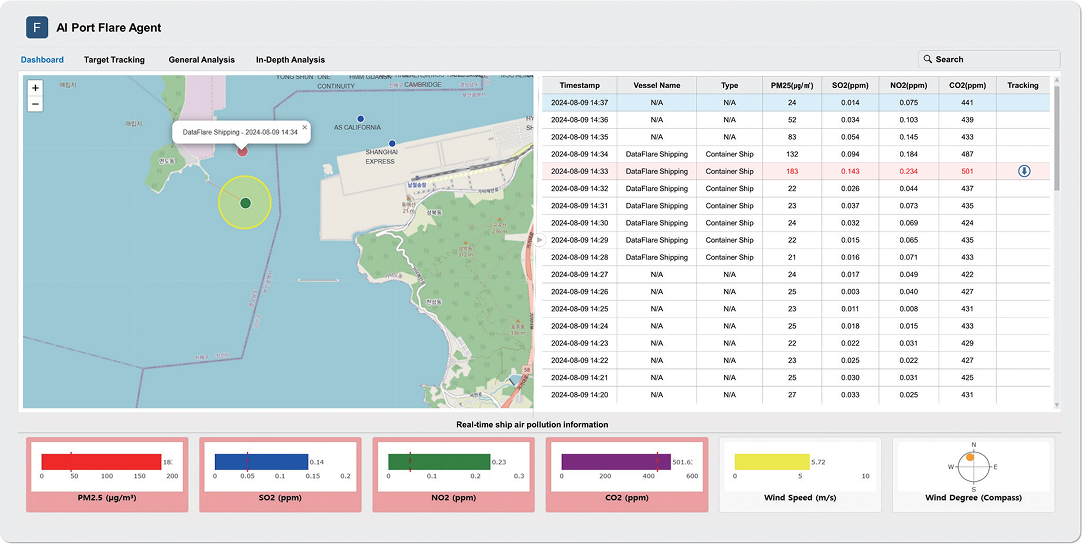 대기 확산 모델이 아닌, 대기중 매연 추적 모델에 대한 빅데이터 분석 기반의 자체 개발 알고리즘을 통해 풍향 풍속에 따른 매연 GIS 이동 좌표값과 선박 이동 좌표값을 정확히 표현합니다.