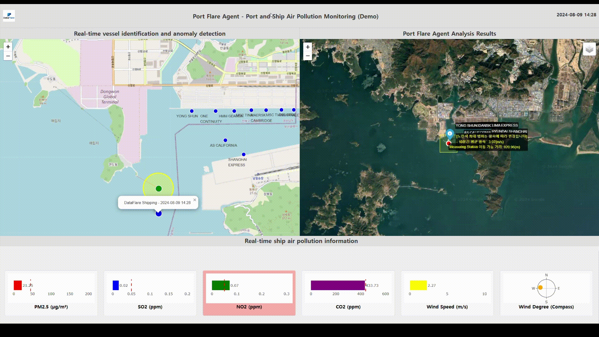 대기 확산 모델이 아닌, 대기중 매연 추적 모델에 대한 빅데이터 분석 기반의 자체 개발 알고리즘을 통해 풍향 풍속에 따른 매연 GIS 이동 좌표값과 선박 이동 좌표값을 정확히 표현합니다.